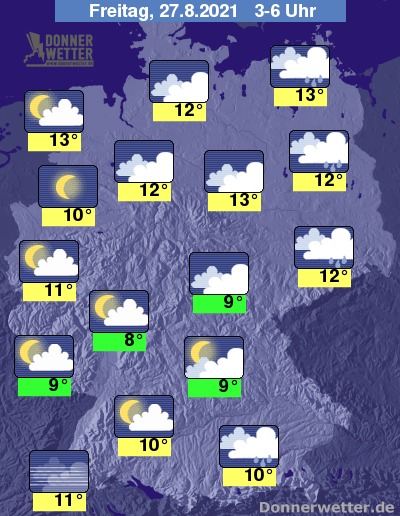 In der bevorstehenden Nacht zieht über der Nordosthälfte Deutschlands meist dichte Bewölkung durch, dazu bilden sich in den östlichsten Landesteilen zum Teil kräftige und gewittrige Schauer, sonst sind nur vereinzelte Schauer möglich. Im Süden und Westen ist der Himmel meist locker, hier und da auch nur aufgelockert bewölkt, dazu bleibt es mit Ausnahme den äußersten Südostens trocken. In Berchtesgaden sind jedoch gebietsweise Schauer möglich. Die Temperatur sinkt auf 13 Grad in Rostock und bis 8 Grad in Wiesbaden.