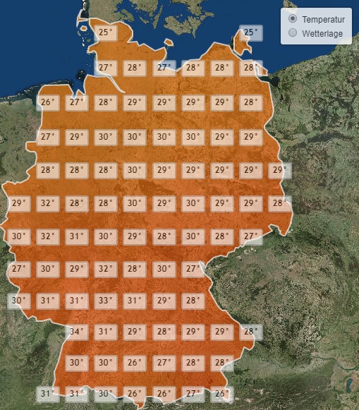 Dazu wird es vielerorts wieder hochsommerlich warm. Meist liegen die Höchsttemperaturen am Nachmittag bei Werten um die 30 Grad oder knapp darunter. Nur an den Küsten bleibt es mit rund 25 Grad etwas kühler. Im Nordschwarzwald werden hingegen bis zu 34 Grad erwartet.