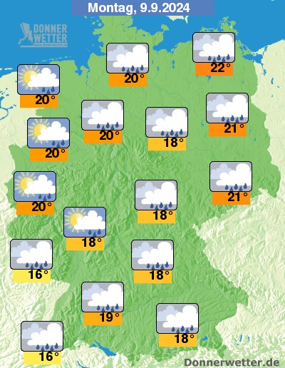 Am Montag zeigt sich der Himmel über weiten Landesteilen wechselnd oder stark bewölkt. Im Nordosten und Südosten fällt am Montag teils ergiebiger Regen, örtliche Unwettergefahr nicht ausgeschlossen! Im Westen und Südwesten sind heute nur vereinzelte Schauer möglich.
