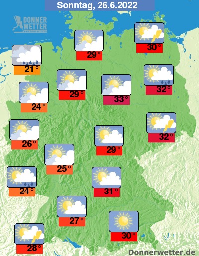 Heute bleibt es im Süden meist sonnig und trocken, im übrigen Bundesgebiet ist es teils heiter, teils ziehen einige Quellwolken auf, dabei bilden sich lokale Schauer und auch Gewitter sind möglich. Die Temperatur erreicht 21 Grad an der Nordsee und bis 33 Grad in der Magdeburger Börde.