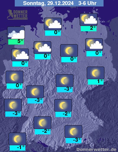 In der Nacht zum Sonntag ziehen im Nordseeumfeld dichte Wolken auf, wobei sie nur selten ein paar Tropfen bringen. Im übrigen Norden ist es meist leicht bis wechselnd bewölkt und trocken. Im übrigen Bundesgebiet zeigt sich der Himmel weitgehend sternenklar, dazu bleibt es trocken. Die Temperatur sinkt auf 5 Grad in Cuxhaven und bis -3 Grad in Saarbrücken.