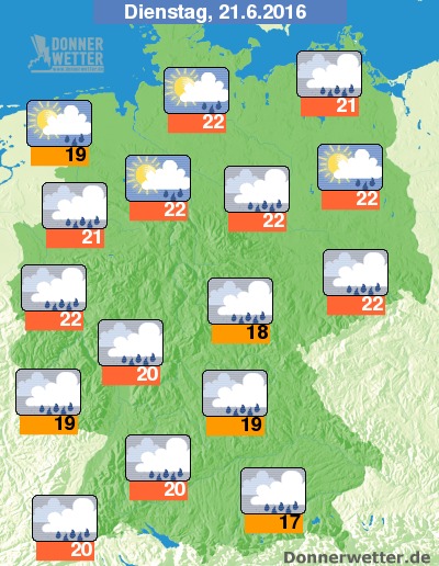 Am Dienstag ziehen neben möglichen Auflockerungen immer wieder dichte Wolken übers Land und es bilden sich wiederholt Schauer, Gewitter bleiben eher selten. Die Temperatur steigt auf 17 bis 22 Grad.