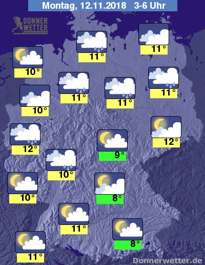 In der folgenden Nacht ist der Himmel über dem Süden und im Nordseeumfeld meist nur locker bewölkt und dazu bleibt es hier weitgehend trocken. Im übrigen Bundesgebiet ist es größetnteils bedeckt und es fällt auch zeitweise Regen, über Sachsen und Thüringen bleibt es allerdings meist trocken. Die Temperatur sinkt auf milde 12 bis 8 Grad.