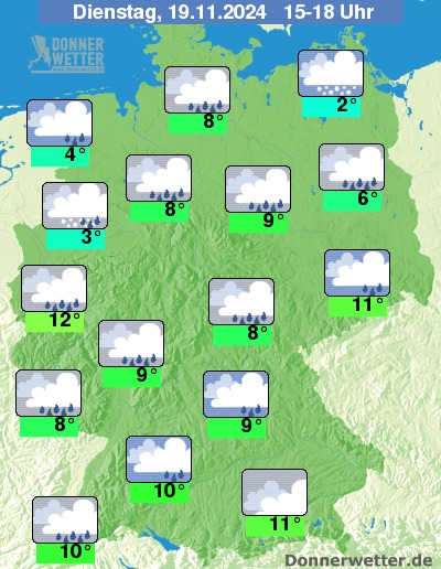 Am Dienstagnachmittag zeigt sich der Himmel stark bewölkt oder es ist bedeckt, dabei fällt von West nach Südost immer wieder teils schauerartiger Regen. In der Nordhälfte gebietsweise auch Schneeregen- oder Schneeschauer. Weitgehend trocken bleibt es am im äußersten Südosten.