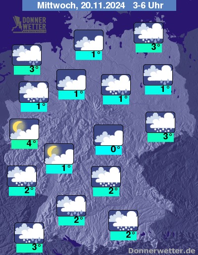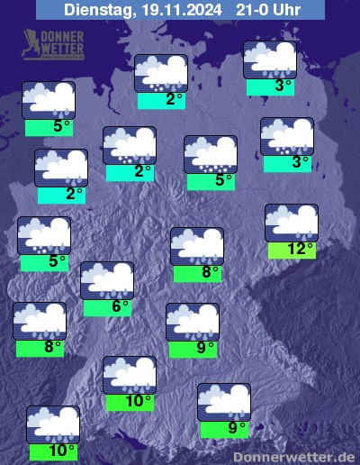 In der Nacht zum Mittwoch bleibt der Himmel stark bewölkt oder es ist bedeckt. Von Nordwesten ziehen dabei Schauer auf, die im weiteren Verlauf auch die Mittelgebirge erreichen; bis in tiefe Lagen ist dann auch Schneefall möglich. Auch im Südosten und an den Alpen in der Nacht teils anhaltender und kräftiger Schneefall bis in tiefe Lagen. Abnehmender Wind.