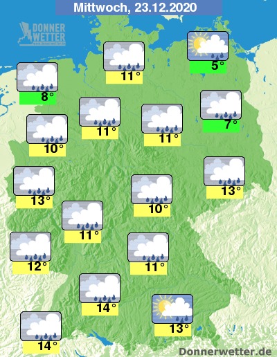 Meist stark bewölkt und häufig Regen, in der Nacht auf den ersten Weihnachtsfeiertag zurückgehende Temperaturen und gebietsweise Schneefall oder Schneeregen.
