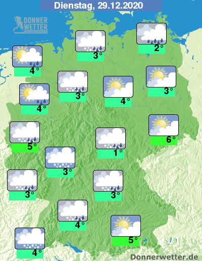 Sowohl im Norden und dort wo Frankreich nahe ist fällt am Silvestertag teilweise Regen oder Schneeregen, im Schwarzwald und im Hunsrück auch Schnee. In den anderen Gebieten wechseln sich Wolken mit gelegentlichen Sonnenstrahlen ab.