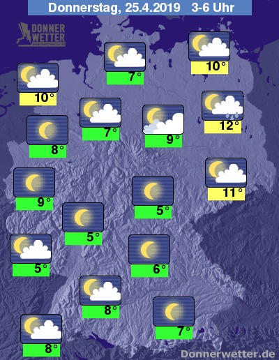 Bis zu den Frühstunden kühlt die Luft spürbar ab. Außer im Nordosten, sowie in Küstennähe werden häufig Temperaturen im einstelligen Bereich gemessen.