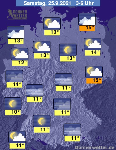 In der kommenden Nacht bleibt der Himmel über der Nordhälfte des Landes häufig stark bewölkt, es kann aber auch vielerorts auflockern. Über der Südhälfte funkeln verbreitet die Sterne und es ziehen nur selten Wolken durch. Es bleibt bundesweit trocken bei Tiefstwerten von 15 Grad in Rostock und etwa 10 Grad in Saarbrücken.