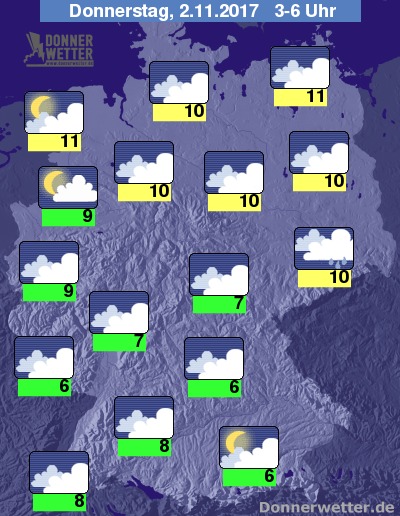 In der Nacht zum Donnerstag ist es verbreitet stark bewölkt oder trüb, vor allem im Osten und Nordosten ist anfangs noch etwas Regen möglich, sonst bleibt es weitgehend trocken. Auflockerungen zeigen sich im Nordwesten des Landes. Die Temperatur sinkt auf 11 bis 6 Grad.