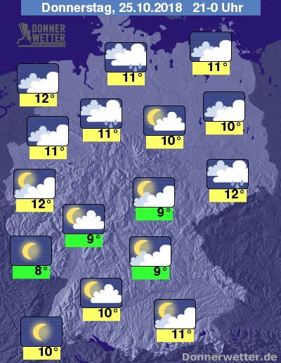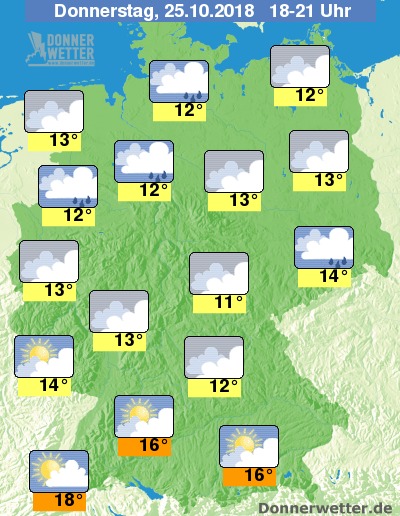 Am frühen Abend bleibt es oft wolkenverhangen, im Norden, sowie am Erzgebirge kann es strichweise noch regnen. Von der Saar bis zum bayrischen Alpenrand bekommt die Wolkendecke zum Teil größere Lücken und örtlich kann man noch einige Strahlen der untergehenden Abendsonne genießen. Die Temperaturen liegen allgemein zwischen 12 und 15 Grad, ganz im Süden werden vor Dämmerungsbeginn noch milde 16 bis 18 Grad erreicht.