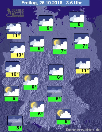 Während der zweiten Nachthälfte bilden sich in der Südhälfte regionale Nebelfelder aus, Richtung Norden halten sich Wolken. An der Nordseeküste kann es etwas regnen, oder zu örtlichen Schauern kommen. Bis zu den Frühstunden kühlt die Luft auf 6 bis 11 Grad ab.