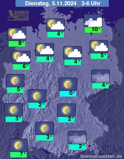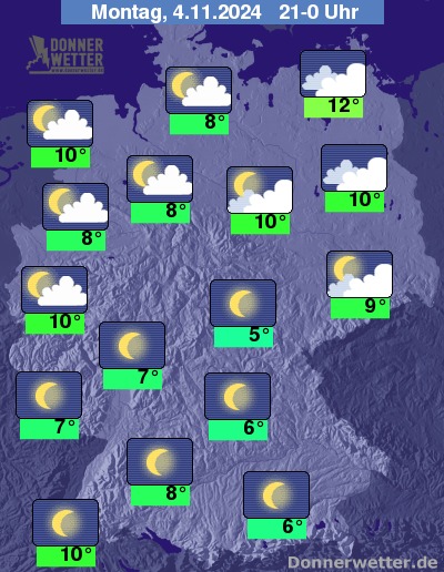 In der Nacht zum Dienstag bleibt der Himmel über dem Nordosten stark bewölkt oder bedeckt und lokal fällt etwas Sprühregen. In den übrigen Landesteilen überwiegt zunächst geringe Bewölkung oder es ist sternenklar, im Nachtverlauf kann sich dann verbreitet Nebel bilden.