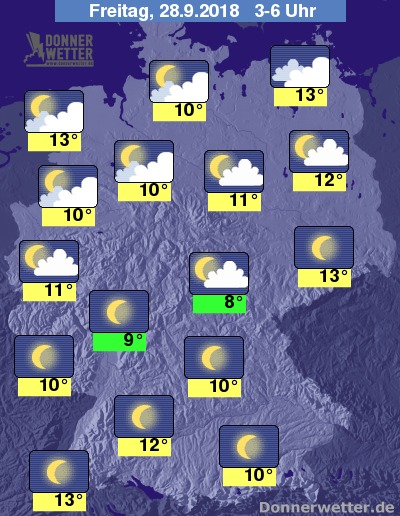 Während der zweiten Nachthälfte werden die Wolken bis zu den nördlichen Mittelgebirgen allmählich etwas dichter, Regen fällt aber nur vereinzelt etwas. Sonst funkeln weiterhin Mond und Sterne. An Gewässern können sich stellenweise Nebelfelder bilden. Im Vergleich zu den letzten Nächten bleibt es aber mit Werten von 8 bis 13 Grad allgemein recht mild. Bodenfröste treten kaum noch auf.