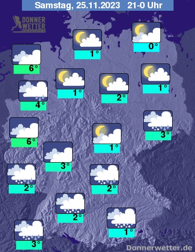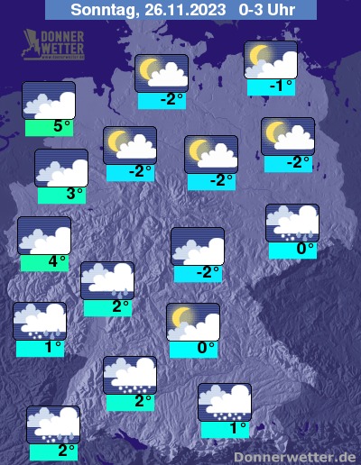 In der Nacht zeigt sich der Himmell über der Nord- und Nordosthälfte locker oder aufgelockert bewölkt und es bleibt meist niederschlagsfrei. Sonst ist es stark bewölkt oder bedeckt und immer wieder muss mit Schneeregen- oder Schneeschauern gerechnet werden. Im Westen fällt unterhalb von 300 bis 500 m Regen.