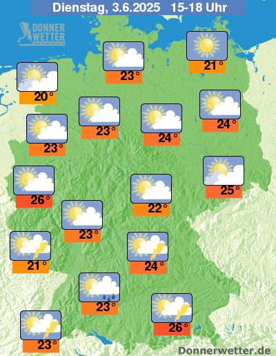 Am Dienstagnachmittag zeigt sich der Himmel über der Nordhälfte häufig heiter und es bleibt trocken. In den südlichen Landesteilen ist es wechselnd oder stark bewölkt, dabei muss zeitweise mit Schauern und Gewittern gerechnet werden, lokale Unwetter nicht ausgeschlossen.