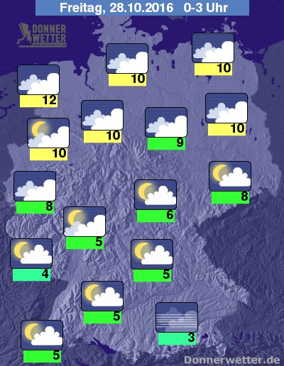 In der Nordhälfte reißt auch im Lauf der Nacht kaum eine Lücke in die Wolkendecke, dementsprechend bleibt es mit Tiefstwerten um die 10 Grad relativ mild.