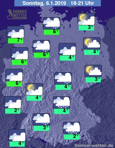 In der Nacht zum Montag ist der Himmel verbreitet stark bewölkt, lediglich im Osten ist es zumeist locker bewölkt, hier und über der Westhälfte des Landes bleibt es weitgehend trocken. Im übrigen Bundesgebiet fällt unter dichten Wolken gebietsweise Regen, Schneeregen oder Schnee. Die Temperatur sinkt auf 5 Grad an der Nordsee und bis 0 Grad am Pfälzer Wald.