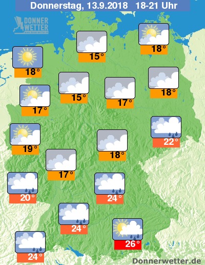 Die Temperaturen liegen vor der Abenddämmerung im Norden und in der Mitte zwischen 15 und 19 Grad. Im Osten und Süden findet man zum Teil noch warme und schwüle Werte zwischen 20 und 26 Grad.