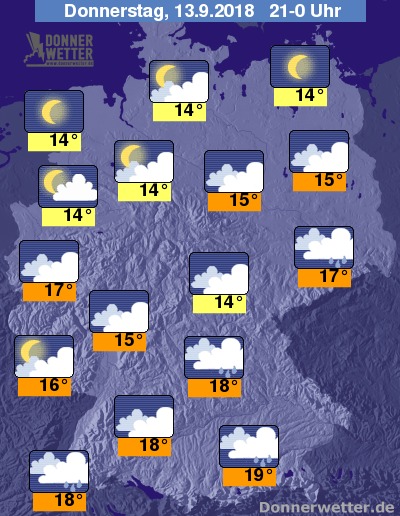 Am frühen Abend präsentiert sich der Himmel meistens von Wolken überzogen. Südlich von Main und Mosel, sowie über Sachsen können sich aus dunkleren Wolkenmassen teils kräftige Regengüsse entladen, vereinzelt blitzt und donnert es dabei. Einige wärmende Strahlen der allmählich untergehenden Sonne kann man im Westen und an den Küsten von Nord- und Ostsee genießen.