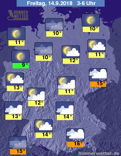 Während der ersten Nachthälfte gehen im Osten und Süden noch örtliche Schauer nieder. Sonst dominieren zwar häufig die Wolken, Regen fällt jedoch nicht. Im Norden und Westen klart der Himmel auf und die Temperaturen gehen zurück.