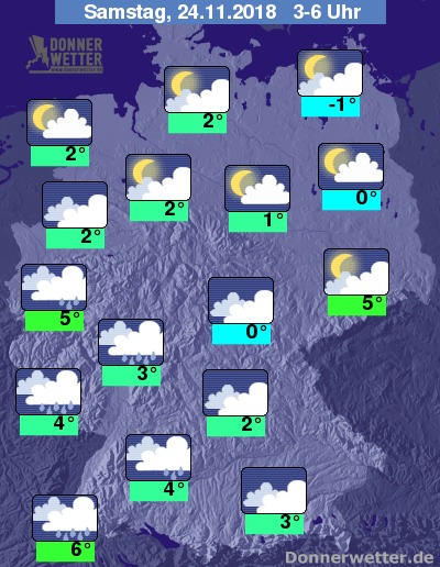 Bis zu den Frühstunden gehen die Temperaturen im Nordosten, sowie im Thüringer Becken zum Teil in den leichten Frostbereich zurück. Im übrigen Bereich liegen die Werte zwischen 1 und 6 Grad. Am mildesten bleibt es dabei unter den Regenwolken.