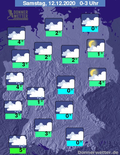 Bis zu den Frühstunden kühlt die Luft im Vergleich zum Abend kaum ab, so dass die Werte weiterhin zwischen 0 und 5 Grad liegen. Leichten Frost gibt es daher nur in Bayern und Thüringen, sowie dort, wo der Himmel etwas aufklart.