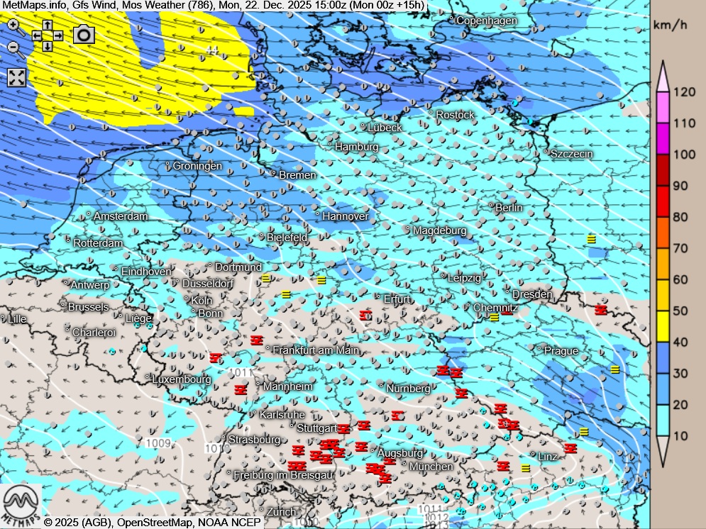 Die Strömungs- / Temperaturkarte sowie die Böen- / Wetterkarte für Montagnachmittag (15:00 Uhr) nach GFS: