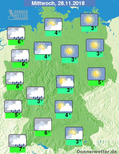 Im Osten gibt es teilweise längere freundliche Abschnitte mit Sonnenschein. Sonst trübt sich der Himmel von Westen her ein und schon am Vormittag beginnt es ganz im Westen leicht zu regnen. Dieser leichte Regen dehnt sich dann im Tagesverlauf etwas weiter Richtung Norden und Osten aus und erreicht das westliche Niedersachen, sowie das Rhein - Main - Gebiet.