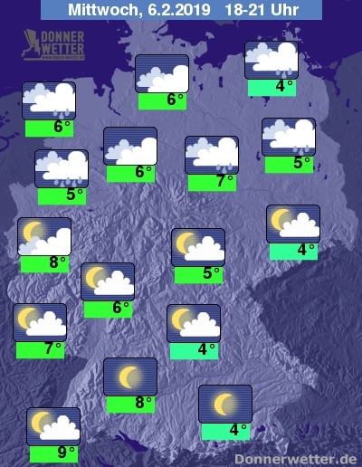 Am Abend fällt von der Grenze zu Benelux, übers Norddeutsche Tiefland hinweg bis zur Oder aus dichter Bewölkung zeitweise Regen. Sonst zeigen sich neben lockerer Wolkenfelder gelegentlich die Sterne. Vor allem im Süden ist es oft auch klar.