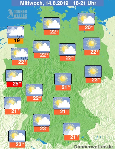Am frühen Abend liegen die Temperaturen noch zwischen 19 Grad an der Emsmündung und 25 Grad in der Kölner Bucht.