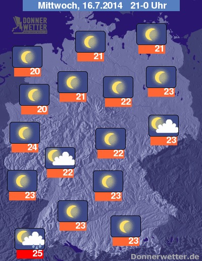 Am Abend fallen auch die Schauerwolken im Osten in sich zusammen und der Himmel kann verbreitet aufklaren und die Sterne freigeben. Die Abendtemperaturen liegen mit teils noch 25 Grad im Breisgau und etwa 20 Grad im Emsland auf einem mediteranen Niveau.