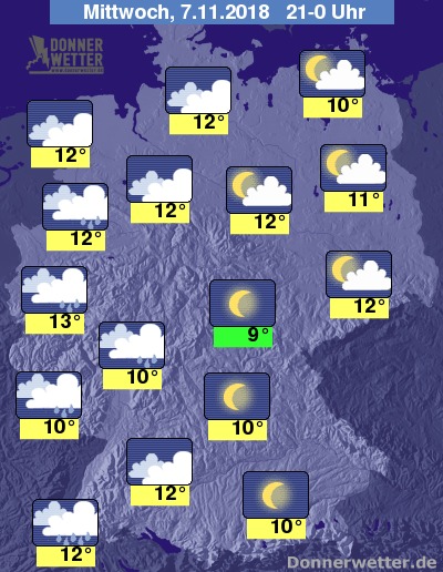 Bis Mitternacht breitet sich der Regen im Südwesten und Westen etwas aus und erreicht auch das Rhein-Main-Gebiet. Im übrigen Bereich zeigen sich teilweise die Sterne. Stellenweise können sich Nebelfelder bilden. Die Temperaturen gehen zurück.