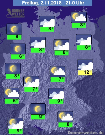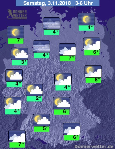 Während der zweiten Nachthälfte breiten sich Nebelgebiete vor allem im Norden aus. Sonst präsentiert sich der Himmel teils bewölkt, teils sternenklar. Regen fällt nicht mehr. Bis zu den Frühstunden kühlt die Luft auf 2 bis 8 Grad ab, bei längerem Aufklaren besteht leichte Frostgefahr, am mildesten sollte es in Sachsen und Brandenburg, sowie im Breisgau bleiben.