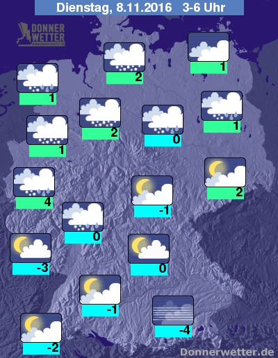 In der Nacht zum Dienstag ist der Himmel im Süden meist nur locker bewölkt oder sternenklar, dazu bleibt es trocken. Auch von Thüringen bis Sachsen bleibt es bei meist aufgelockerter Bewölkung weitgehend trocken. Im übrigen Bundesgebiet dominiert dagegen dichte Bewölkung und es fällt verbreitet Regen, Schneeregen oder Schnee, dazu kann es teils gefährlich glatt auf den Straßen werden! Die Temperatur sinkt auf 4 Grad in Köln und bis -4 Grad im Raum München.