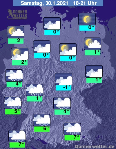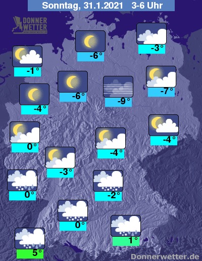 In der Nacht zum Sonntag fällt im Süden unter dichten Wolken verbreitet Schnee. Vom Breisgau bis nach Berchtesgaden auch Schneeregen oder Regen. Über der Nordhälfte des Landes ist es meist locker bewölkt oder sternenklar, im übrigen Land ist es auch teils stark, teils aufgelockert bewölkt, dazu bleibt es trocken. Die Temperatur sinkt auf 5 Grad in Freiburg und auf -9 Grad im Westhavelland.