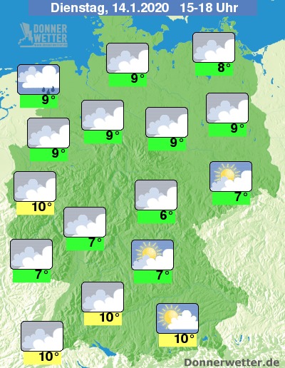 Am frühen Nachmittag hält sich über dem Westen und Norden meist eine kompakte Wolkendecke, aus der es gelegentlich leicht regnet oder nieselt. Im Osten und Süden gibt es hingegen größere Aufheiterungen und es bleibt in der Regel niederschlagsfrei.