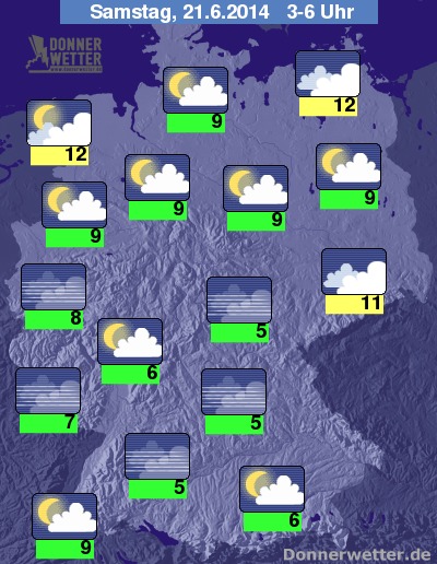In der Nacht bleibt es überwiegend bei wechselnder Bewölkung, besonders von der Mitte bis in den Süden wird es häufig klar, zum Teil ist es aber auch neblig-trüb, dafür trocken. Die Tiefstwerte liegen bei 12 Grad an Nord- und Ostsee und etwa 5 Grad an der Schwäbischen Alb.