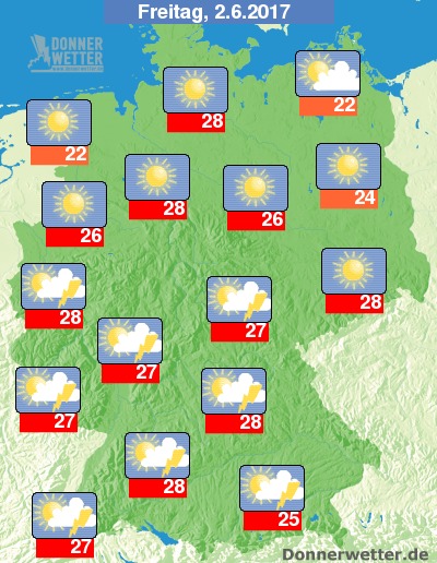 Der Tag startet abgesehen einzelner Nebelfelder, in großen Teilen Deutschlands mit blauem Himmel und viel Sonnenschein. Ab Mittag quellen dann aber in der Südwesthälfte die Wolken bei zunehmender Schwüle mächtig in die Höhe und produzieren regional teils kräftige Gewittergüsse. Dabei droht Platzregen und Hagelschlag. Sonst bleibt es überwiegend trocken. Die Höchsttemperaturen klettern auf sehr warme 23 bis 30 Grad. Kühler ist es nur an der Küste und auf den Inseln, sowie auf den Bergen. Der Wind kann bei Gewittern böig auffrischen, sonst ist er schwach.