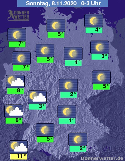 In der Nacht auf Sonntag zeigt sich der Himmel über weiten Landesteilen sternenklar, im Westen und Südwesten verdichtet sich die anfänglich noch lockere Bewölkung im Nachtverlauf. Schauer sind aber nicht zu erwarten.