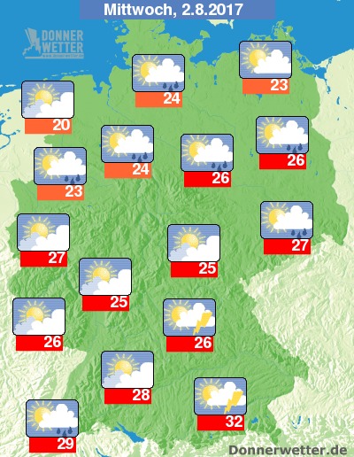 ist es teilweise bewölkt mit örtlichen Schauern, teilweise auch freundlich mit längeren sonnigen Phasen. Im Süden und in den östlichen Mittelgebirgen können sich im Tagesverlauf in sehr warmer und schwüler Luft einzelne teils kräftige Gewitter entwickeln. Die Höchsttemperaturen liegen meist zwischen 21 und 28 Grad. Am Oberrhein, Bodensee, sowie in Teilen Bayerns können auch wieder 30 Grad erreicht werden. In der Nacht auf Donnerstag zieht im Nordwesten Regen auf.