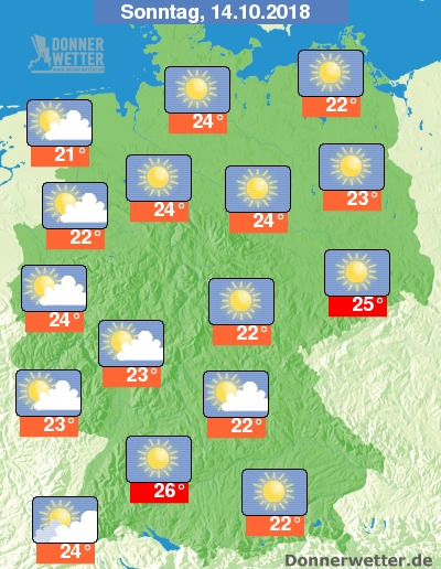 Am Sonntag scheint nach Auflösung einzelner Nebelfelder wieder häufig die Sonne und es ziehen meist nur sehr wenige oder garkeine Wolken durch. Westlich des Rheins werden allerdings gebietsweise einige Wolken erwartet, dabei bleibt es aber noch trocken. Die Temperatur steigt auf spätsommerliche 21 bis 26 Grad.