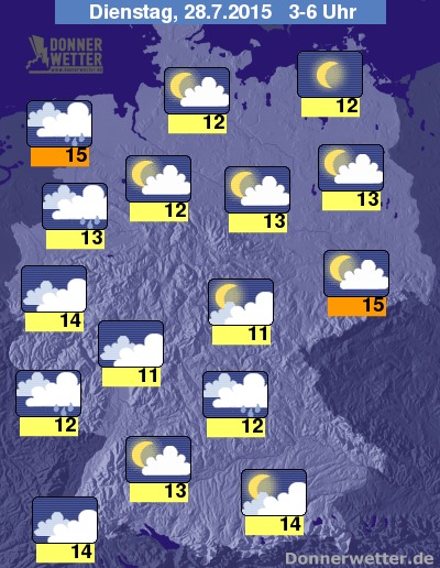 In der Nacht zum Dienstag ziehen besonders in den westlichen Landesteilen oft dichte Wolken durch, dabei fällt auch zeitweise Regen. Im Süden sind bei teils dichten Wolken einzelne Schauer möglich. Im übrigen Deutschland ist es hingegen meist locker bewölkt oder auch sternenklar und weitgehend trocken. Die Temperatur sinkt auf 15 Grad in Riesa und bis 11 Grad im Grabfeld.