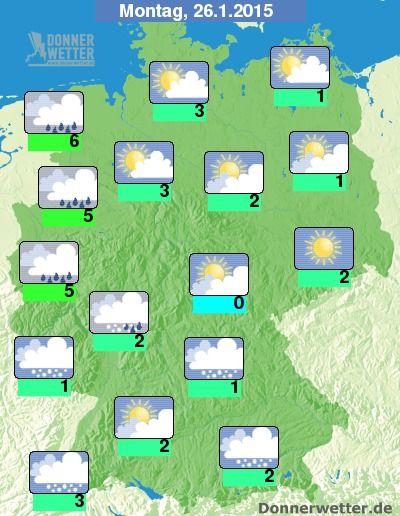 Heute ist es im Norden und Osten anfangs noch häufig heiter oder aufgelockert bewölkt und trocken, sonst startet der Tag aber bereits mit verbreitet dichten Wolken aus denen immer wieder Regen, Schneeregen oder Schnee fällt. Im Tagesverlauf ziehen die dichten Wolken und die Niederschläge auch weiter nach Osten, bis zum Abend erreichen sie auch die östlichsten Landesteile. Dazu besteht erhöhte Glättegefahr. Die Temperatur steigt auf 0 Grad am Thüringer Wald und bis 6 Grad an der Nordseeküste.