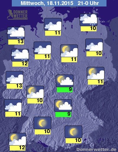 In der Nacht zum Donnerstag fällt zunächst über der Nordhälfte unter dichten Wolken zum Teil kräftiger Regen. Weiter nach Süden hin ist es zunächst noch trocken und teils aufgelockert bewölkt, im weiteren Verlauf erreichen die Regenwolken aber auch den Norden von Bayern und Baden-Württemberg. Gegen Morgen lassen die Niederschläge im Norden und Westen hingegen nach und gebietsweise kann es auch auflockern. Die Temperatur sinkt auf 14 Grad in Aachen und bis 9 Grad im München. Es weht verbreitet starker, teils auch stürmischer Wind, an der Nordsee herrscht Sturm mit möglichen Orkanböen.