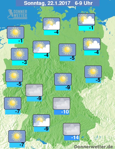 Die Temperaturen liegen am Sonntagmorgen bei Werten um -14 Grad C am Alpenrand und um -1 Grad C an den Küsten.