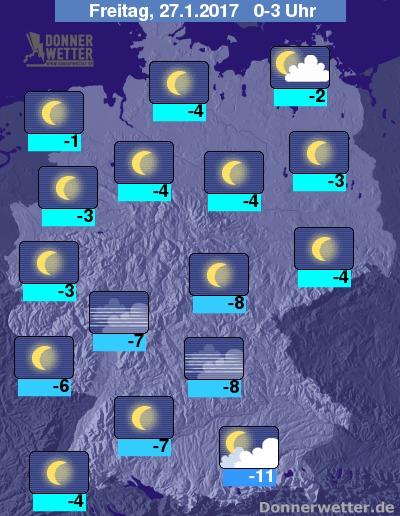Die Nacht wird fast in der gesamten Bundesrepublik sternenklar, lediglich in den Morgenstunden bilden sich im Süden stellenweise Nebel- und Hochnebelfelder. Dazu wird es frostig. Mit Temperaturen knapp unter dem Gefrierpunkt bleibt es an den Küsten verhältnismäßig mild, im Süden sind auch zweistellige Minusgrade möglich.