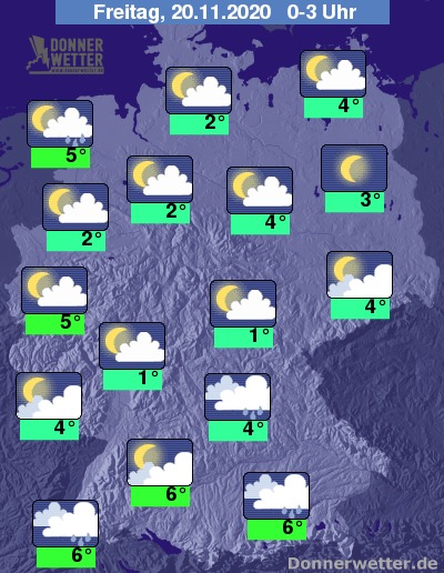 Während der zweiten Nachthälfte fallen an den Alpen weitere Stauniederschläge, die Schneefallgrenze sinkt dabei unter 1000 Meter. Sonst klart der Himmel zum Teil für längere Zeit auf. Besonders an den Küsten sind einige Schauer möglich, eventuell mischen sich auch Graupelkörner oder nasse Schneeflocken unter die Tropfen.