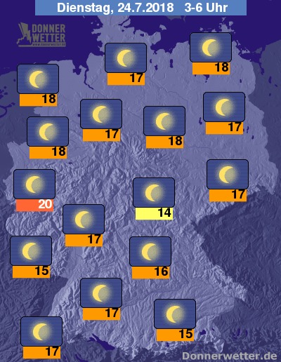 In der kommenden Nacht zeigt sich das Land unter einem ausnahmslos sternenklaren Himmel, dazu bleibt es natürlich trocken. Die Temperatur sinkt auf tropische 20 Grad in Köln und bis etwa 14 Grad im Vogtland.