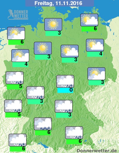 Die Höchstwerte liegen zwischen 0 Grad in Thüringen und 6 Grad an den Küsten und am Alpenrand.